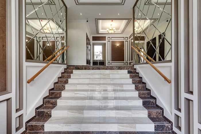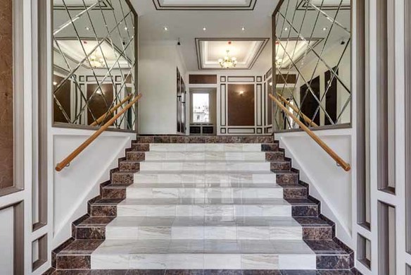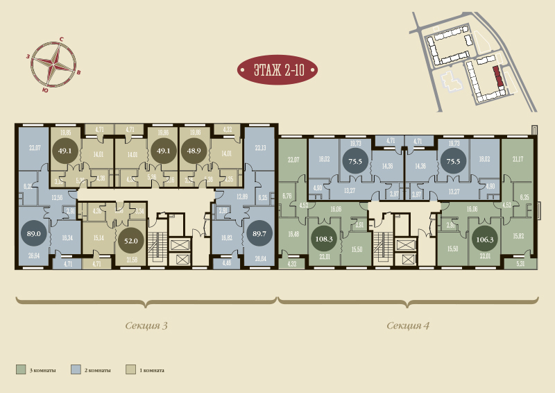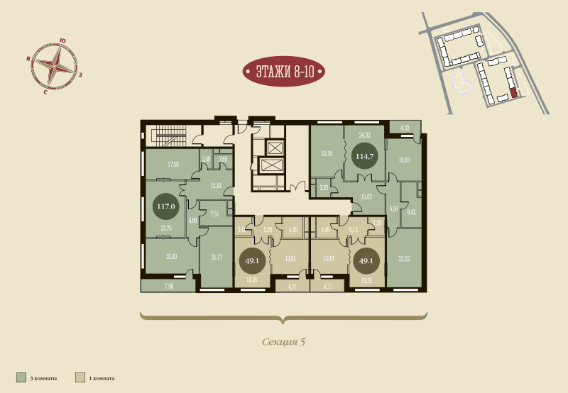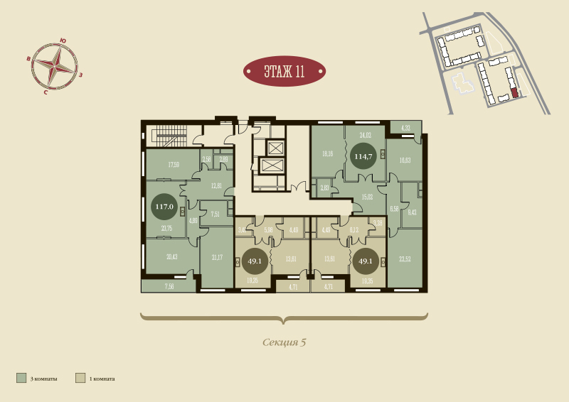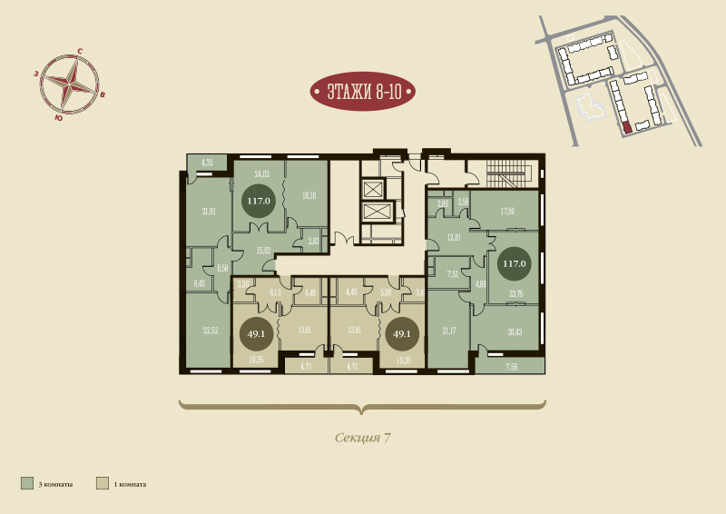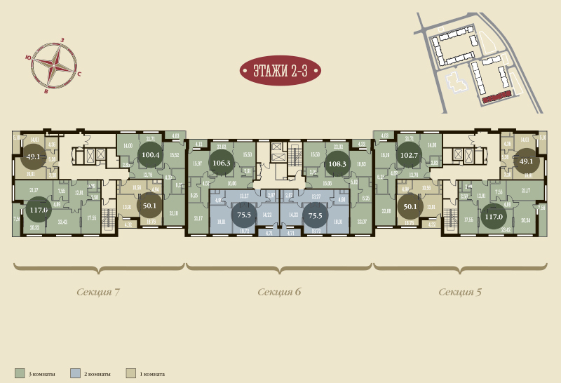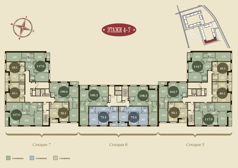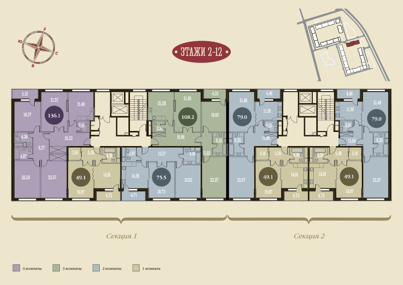 Комплекс премиум-класса включает два дома переменной этажности (11-13 этажей), образующих просторные внутренние дворы.