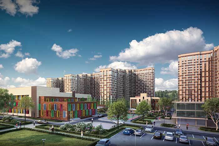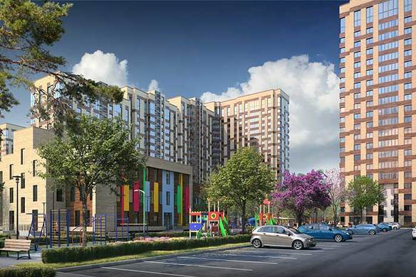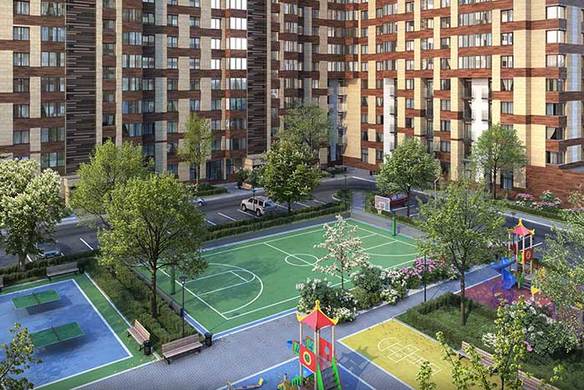 - Закрытые дворы с пешеходными тротуарами, детскими и спортивными площадками;