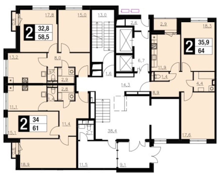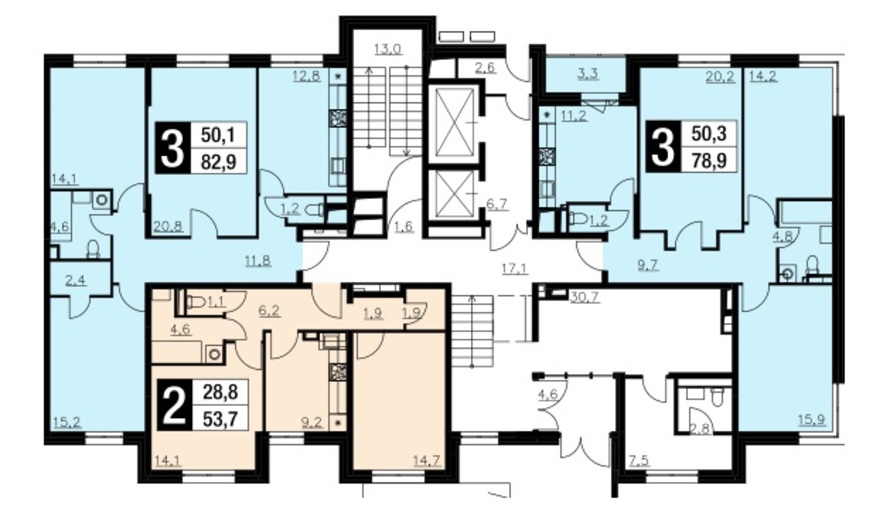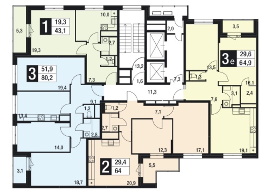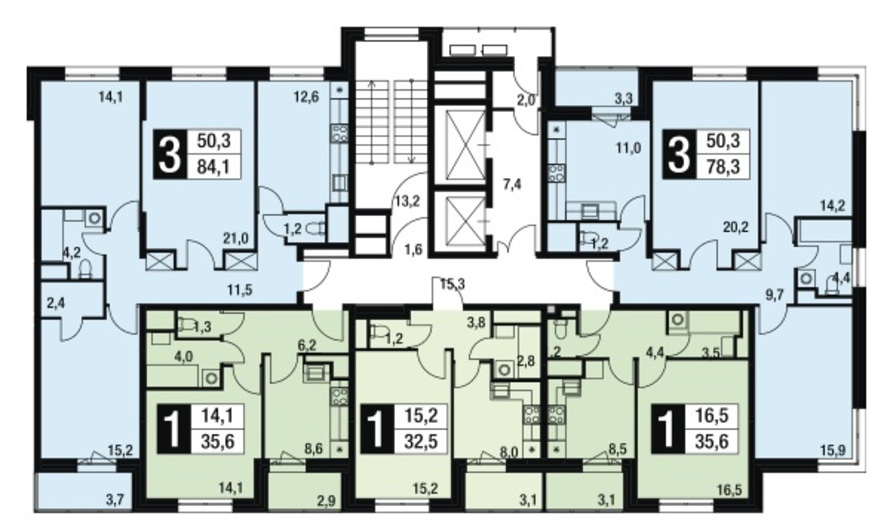 Планировка трехкомнатных квартир здесь тяготеет к традиционному варианту: большая гостиная, достаточно просторная кухня и спальни примерно одинаковых площадей. В «трешке» площадью 78 кв. м. под гостиную отводится 20 кв.м, под спальни — 14 и 15 кв. м., а под кухню — 11,8 кв. м. Подобные «пропорции» поддерживаются и в распашных двухкомнатных квартирах. Например, в 66-метровой на гостиную отводится 21,6 кв. м, на спальню — 18,2 кв. м, а на кухню — 11 квадратов.