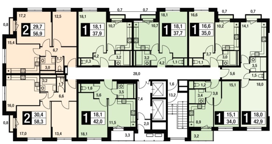 В линейных же «двушках» гостиная и спальня могут сравняться по площади — в 53-метровой квартире на каждое из жилых помещений отводится лишь по 14 с небольшим кв. м., а на кухню — 9. «Однушки» отличаются средним размером комнат — от 14 до 17 кв. м. и 8-10 метровым кухнями.