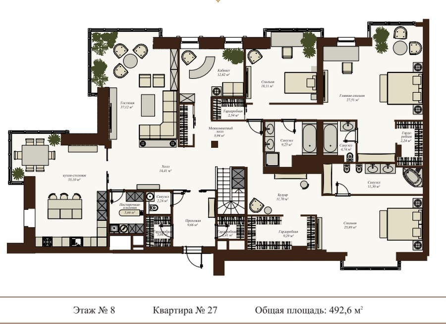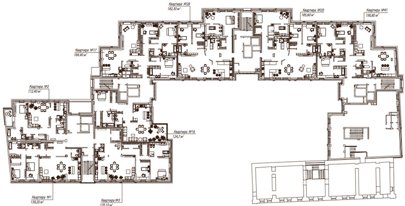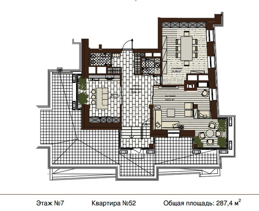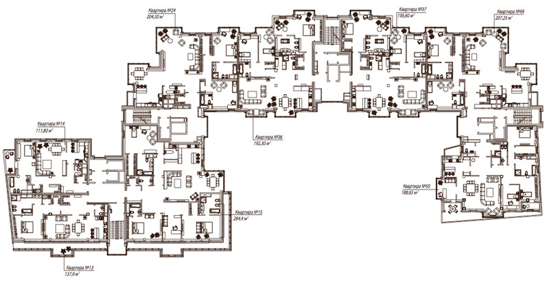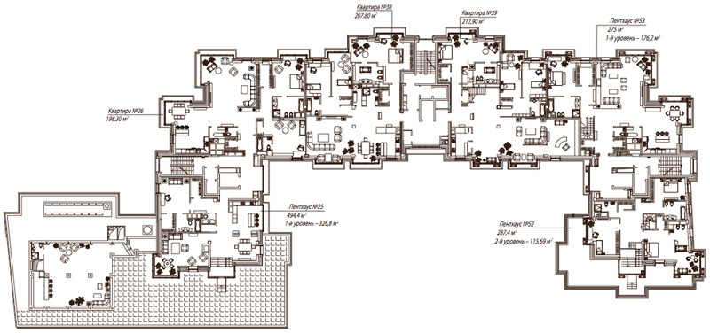 Планировка – свободная. Удобное расположение колонн позволяет разграничить гостевую и спальную зоны. В помещениях предусмотрены эркеры, большие балконы и лоджии. Выполняется панорамное остекление. Высота потолков достигает 3,05 м. Площадь пентхаусов - 250-500 кв.м. Они имеют собственные стеклянные террасы с отдельными входами.