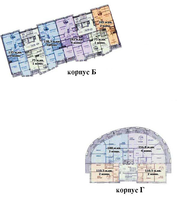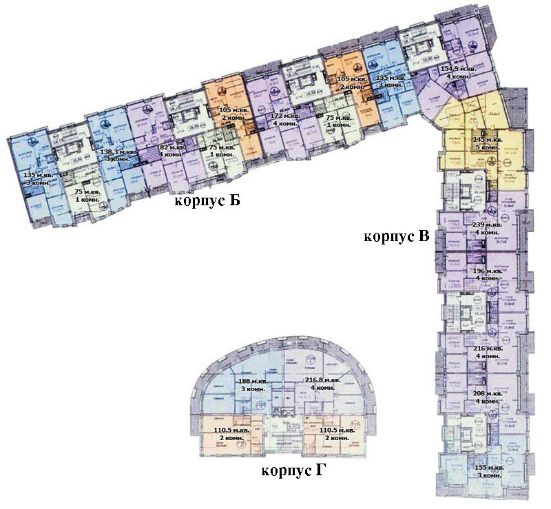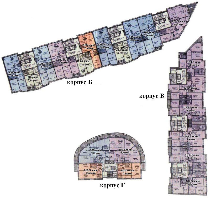 Комплекс включает в себя 2-4-комнатные апартаменты площадью 75-208,7 кв.м. В секциях «Б» и «В» расположены пентхаусы с террасами площадью до 66 кв.м. В помещениях выполняется панорамное остекление, монтируются радиаторы с терморегуляторами, проводятся телекоммуникационные линии.