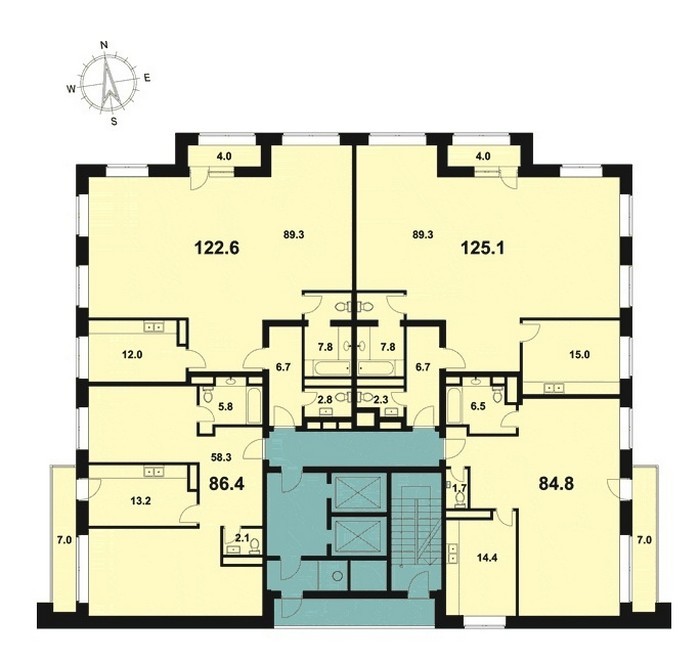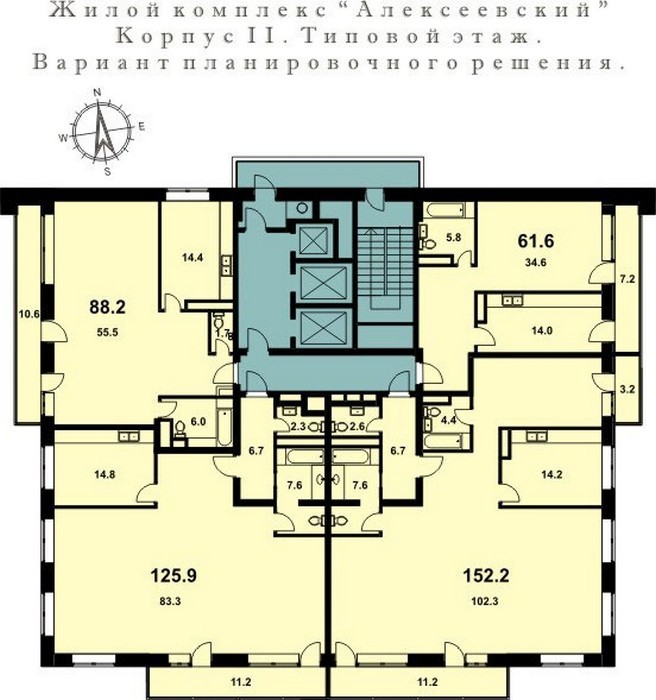 Внешние стены дома оформлены плитами «под кирпич» и окрашены в светлые тона. Первые этажи корпусов занимают объекты внутренней инфраструктуры – торговые площадки, детские комнаты и т.п. Застройщиком представлены 142 1-5-комнатные квартиры площадью 54,7-210 кв.м. Планировка – свободная. Последний этаж высотного корпуса отведен под пентхаус с панорамным остеклением.