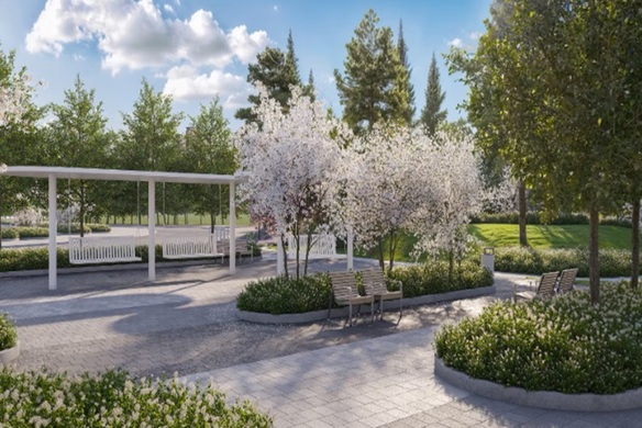 На территории внутренних дворов высаживаются деревья-крупномеры , вдоль прогулочных бульваров установлены скамейки и разбиты газоны, а в лаунж-зонах с фонтанами предусмотрены уютные беседки.