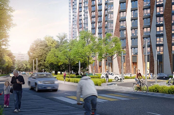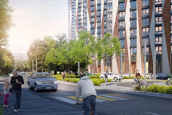 Новый комплекс — пять монолитных «башен» высотой в 25 этажей, которые должны стать новой доминантой района. Необычные решения вентилируемых фасадов и огромные окна подчеркивают современный стиль, в котором выдержаны здания.