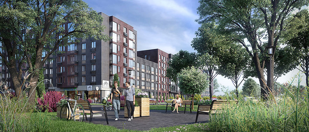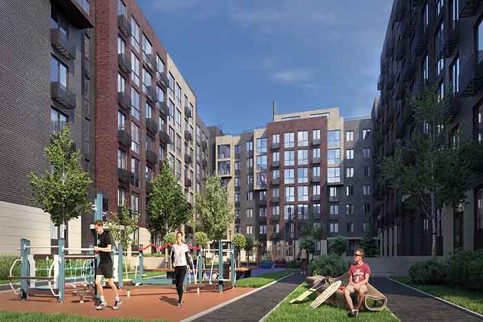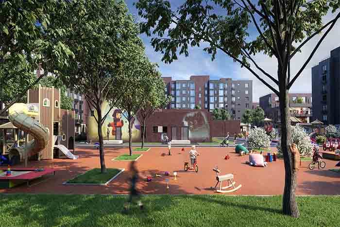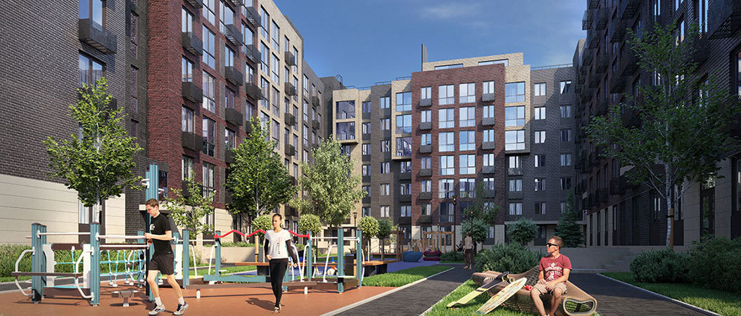 - Закрытые зеленые дворы с игровыми площадками и местами для отдыха;