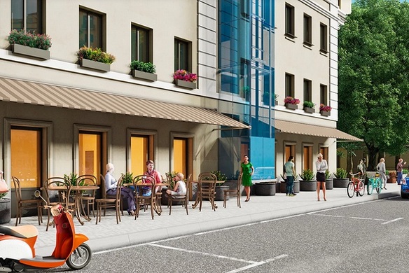 Внутренний двор оформлен как зона отдыха для жителей. На первом этаже откроется кафе. Для автомобилей оборудуется подземный паркинг.