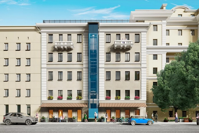 Пятиэтажный особняк постройки начала прошлого века, выдержанный в неоклассическом стиле, отреставрирован с сохранением исторического фасада - «изюминкой» его является наружная лифтовая шахта с панорамным остеклением.