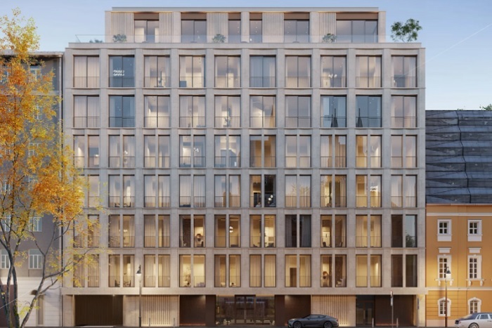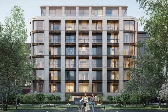 Концепция разработана английским бюро «John McАslan+Partners». Современный образ 8-этажного здания формируют округлые окна, в отделке фасадов используют натуральный камень и алюминий. Дом в бежевых оттенках с панорамными окнами гармонично впишется в историческую атмосферу переулка.