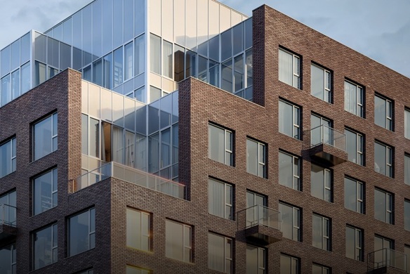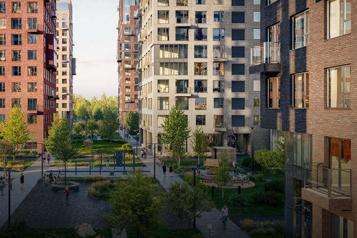 Фасады выполнены из фактурного кирпича, который напоминает текстуру природных материалов. Вставки из стекла создают эффект невесомости, а чёткие геометрические линии и строгие формы корпусов придают кварталу современный и стильный вид.
