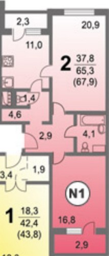 - 1-комнатные — 45, 5 кв. метра ( 2 варианта планировки)