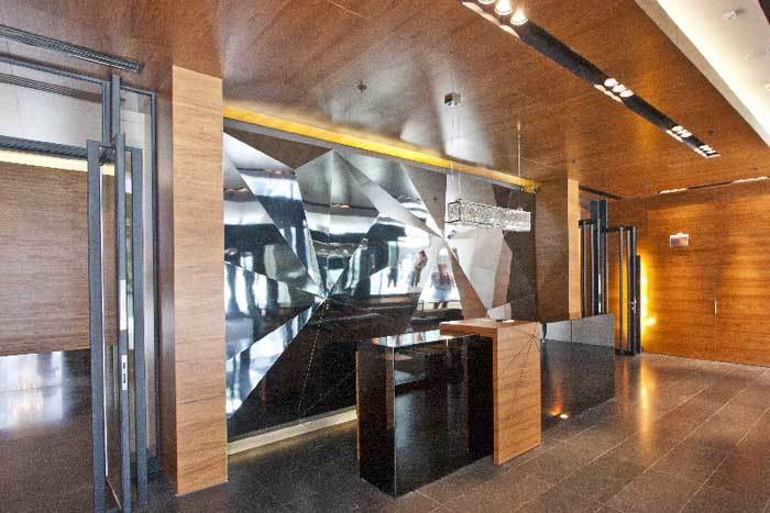 Дом построен по монолитной технологии с вентилируемым фасадом, в котором сочетается натуральный гранит, алюминиевые композитные панели и стекло. Также керамическим гранитом облицованы ступени и площадки лестниц.