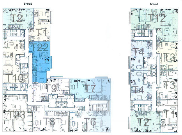 Все квартиры имеют свободную планировку и сдаются без отделки. Площадь квартиры варьируется от 130 до 186 кв.м. Высота потолка обычной квартиры составляет 3.35 м., пентхауса - 3,65 м.