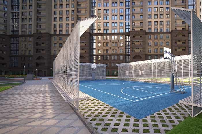 Территория комплекса закрыта от посторонних и находится под охраной. Здания образуют полностью закрытый внутренний двор-патио, превращенный стараниями ландшафтных дизайнеров в зеленый мини-парк. Для детей оборудуются игровые площадки.