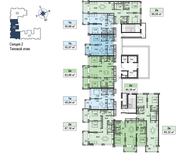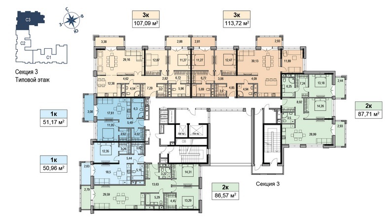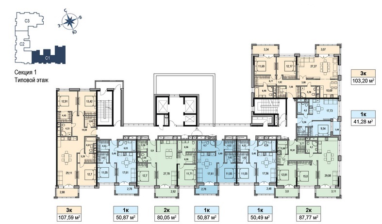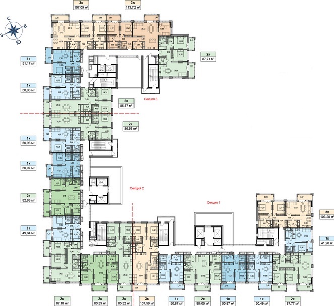 Площадь квартир:41.3 — 107.6 м2