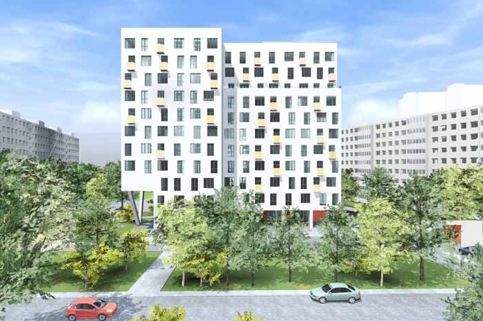 Новый комплекс — двухсекционный монолитный дом высотой в 11 этажей. Выдержан он в ярком современном стиле — необычная отделка вентилируемых фасадов, витражное остекление входных групп, большие, ассиметрично расположенные окна.