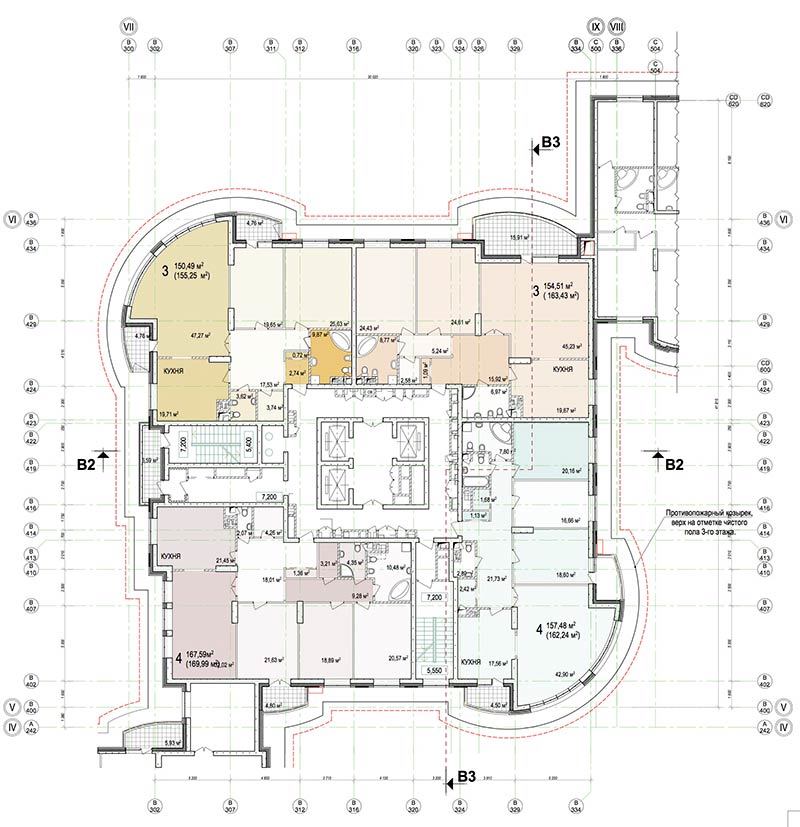 Жилой комплекс включает 379 квартир, разной площади от 99 кв. м до 320 кв.м. и разной индивидуальной планировки. Предусмотрены двухкомнатные квартиры площадью 99 кв.м., трехкомнатные – 123-178 кв. м, четырехкомнатные – 152-221 кв. м. и пентхаусы 285-353 кв. м.