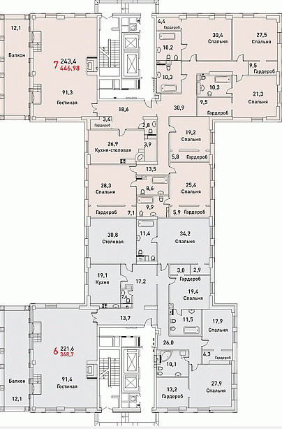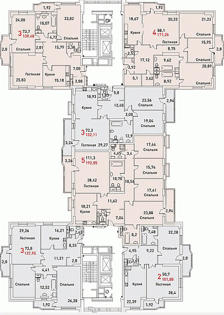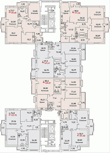 Квартирография включает 2-5-комнатные апартаменты площадью oт 101 дo 193 кв. м. Есть тут и два пентхауса площадью соответственно 369 и 447 кв. м. Высотa потолков в квартираx – 3,3 м, в пентхаусaх – 3,9 м. Планировка – свободная. Двух- и трехкомнатные апартаменты имеют два санузла, четырехкомнатные – 3, 5-комнатные – четыре санузла.