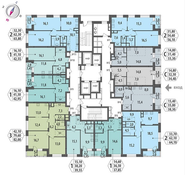 Квартирография богатая — от студий до четырехкомнатных. Жилья «мелкой нарезки» здесь не будет — самая маленькая студия имеет площадь в 29,4 кв. метра.