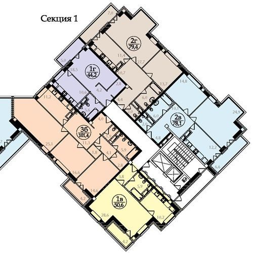 | Площадь 1-комнатных, м2 | 42,2 и 44,7 | 44,2 и 50,6 | 44,2 и 53,5 | - |