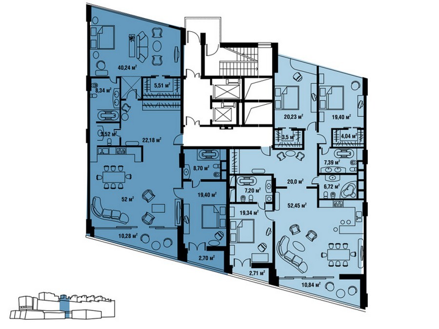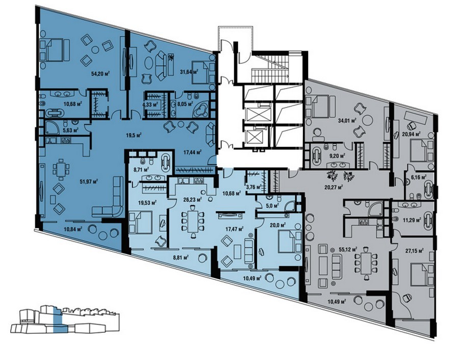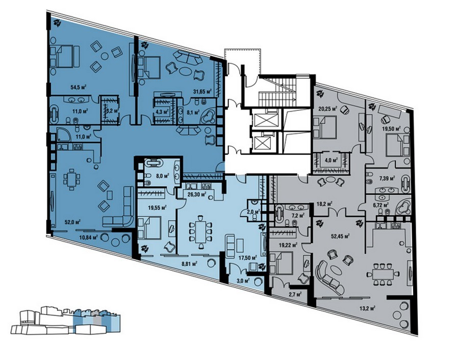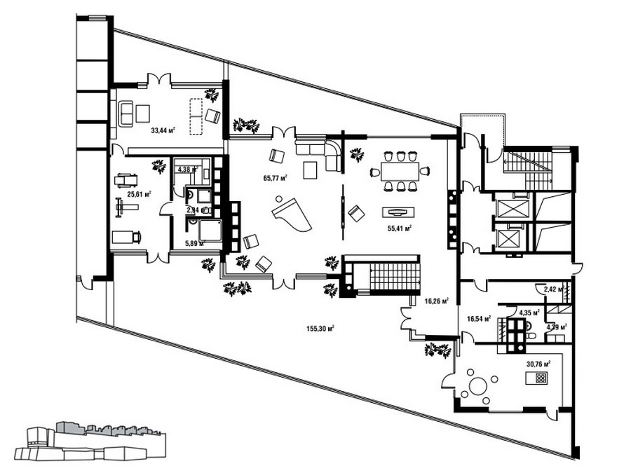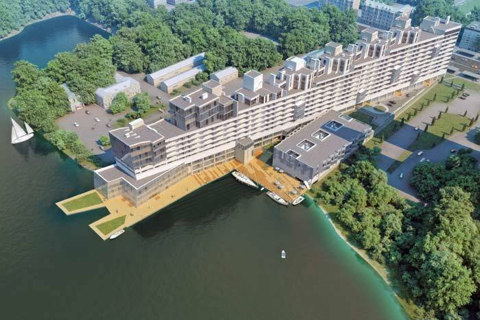 Оригинальность архитектурного решения заключается в диагональном расположении жилого корпуса по отношению к береговой линии. Это акцентирует внимание жильцов и их гостей на водной глади, а на нее, как известно, можно смотреть бесконечно долго.