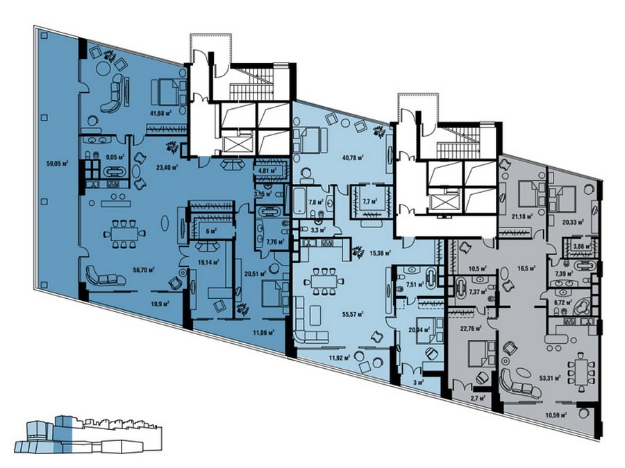 На верхних этажах жилого комплекса «Город яхт» расположены пентхаусы площалью от 350 кв. м. Особой «изюминкой» комплекса является уникальный трехуровневый пентхаус площадью 540 кв.м. Во всех пентхаусах выполнено панорамное остекление — из окон открываются роскошные виды на водохранилище, имеются индивидуальные выходы на эксплуатируемую кровлю.