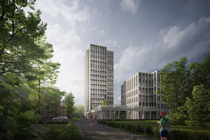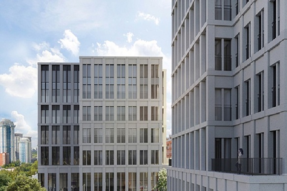 Два здания переменной высотности (от 5 до 15 этажей) со светлыми фасадами из натурального камня и огромными окнами возводятся на едином стилобате — он отведен под объекты внутренней инфраструктуры.