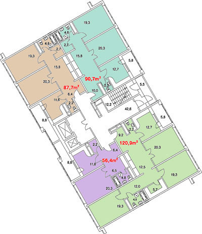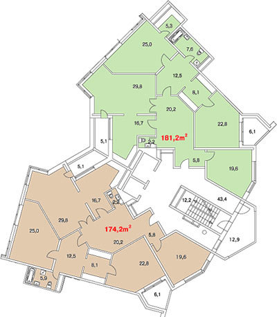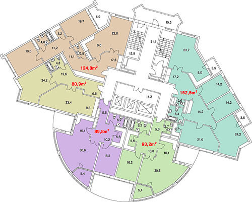 Первые этажи монолитно-кирпичного здания переменной этажности (17-19), состоящего из нескольких секций, отведены под инфраструктурные объекты, а также офисные помещения. В комплексе представлены 389 квартир свободной планировки площадью от 103 до 292 кв. м. В квартирах выполнено панорамное остекление, установлены 2 санузла. Высота потолков – 3 м. На 17-18 этажах дома предусмотрено размещение двухуровневых пентхаусов.