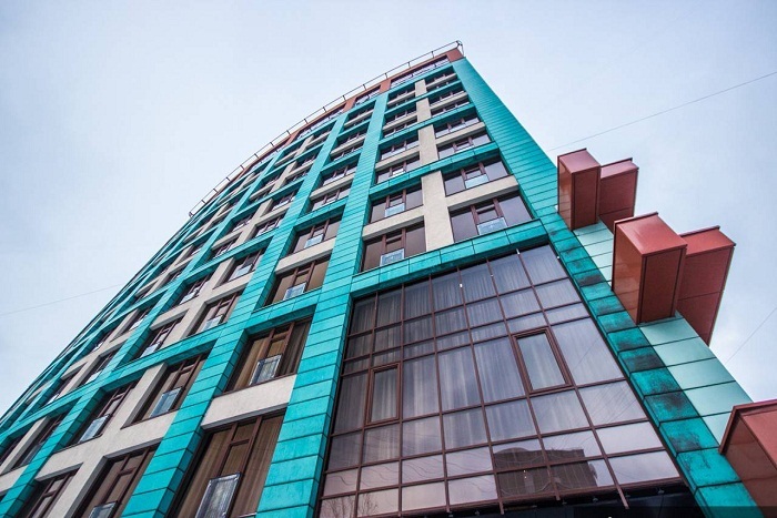 Клубный дом «Хортус Гармония» - 15-этажное монолитное здание с очень оригинальным навесным вентилируемым фасадом, в отделке которого использована медь и дерево. Интересные детали — французкие окна с мелкой расстекловкой, колонны и витражи, а также роскошная авторская отделка входных групп.
