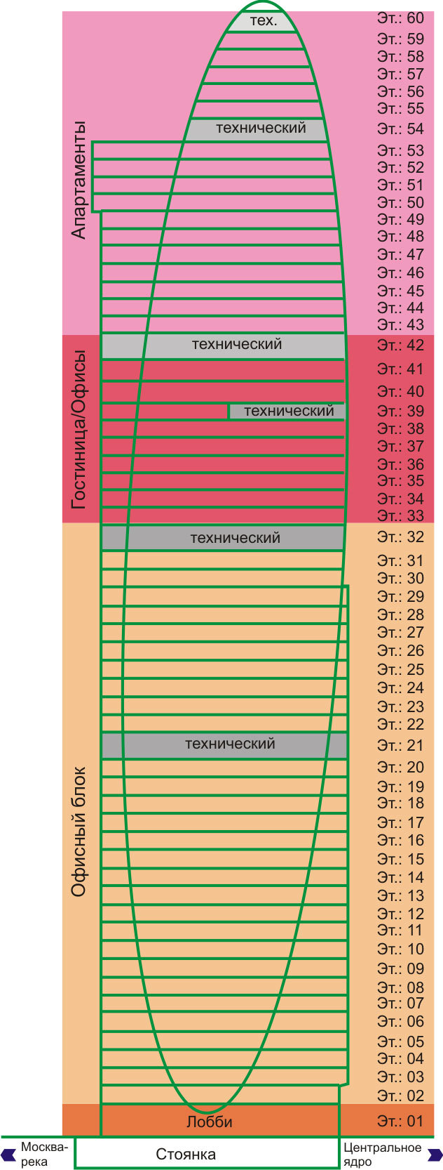 Офисные помещения занимают 1-29 этаж, начиная с 30-го, и по 42-й этаж расположены гостиничные номера, а элитные апартаменты находятся на 43-60 этажах здания. Таким образом, из окон эксклюзивных квартир открывается великолепный вид на Университет, Кремль, Москву-реку, Поклонную гору, Воробьевы горы и весь исторический центр российской столицы.