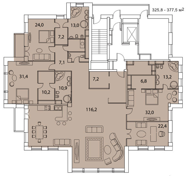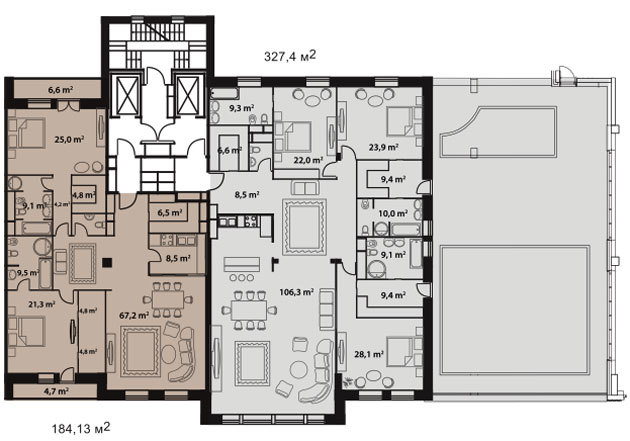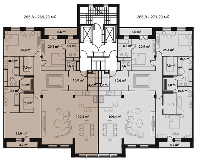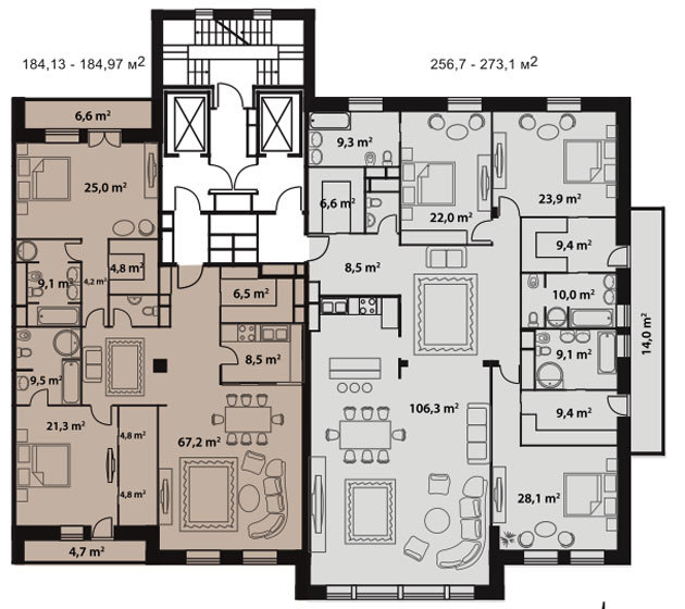 Площадь квартир:256 м2