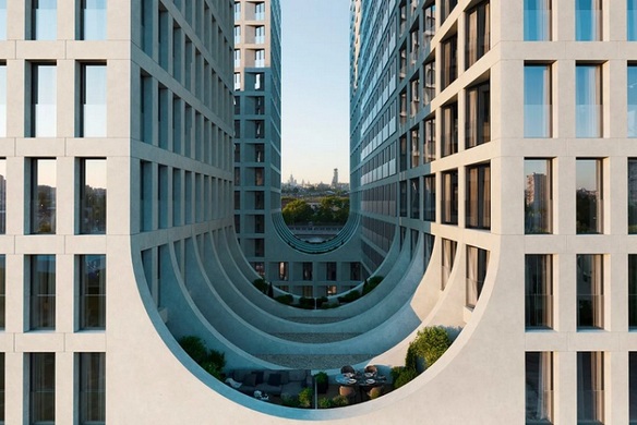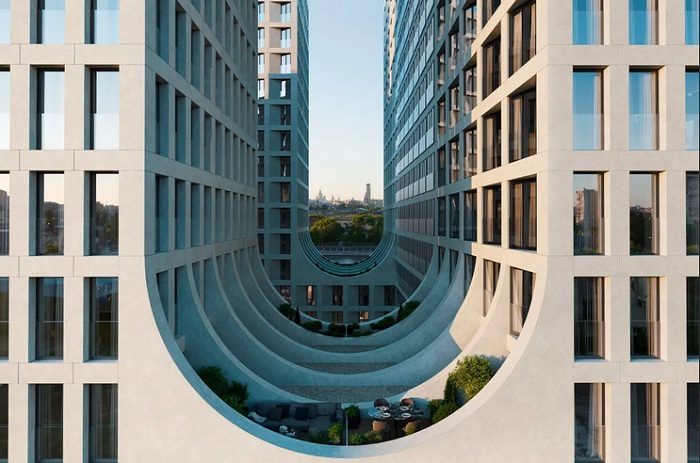 Место для строительства выбрано на первой линии Москвы-реки, так что значительная часть квартир обладает прекрасными видовыми характеристиками. Здание переменной высотности (10-16 этажей) возводится по авторскому проекту, привлекая внимание необычным силуэтом и фасадами с панорамным остеклением.