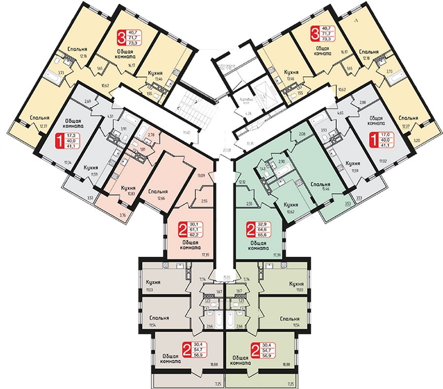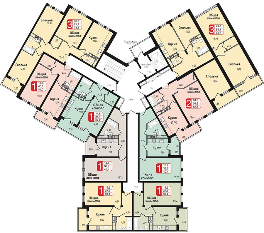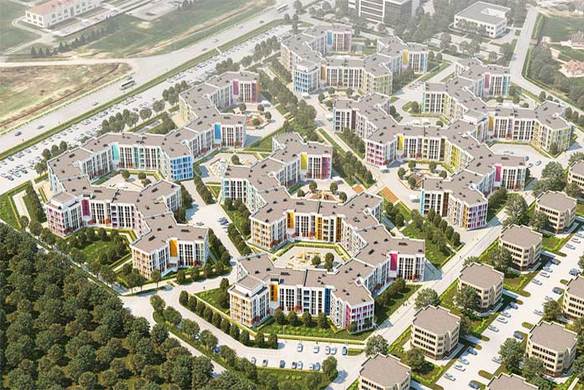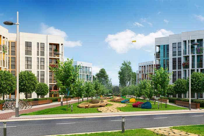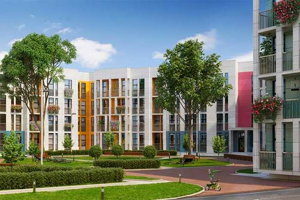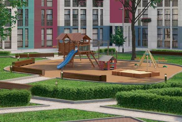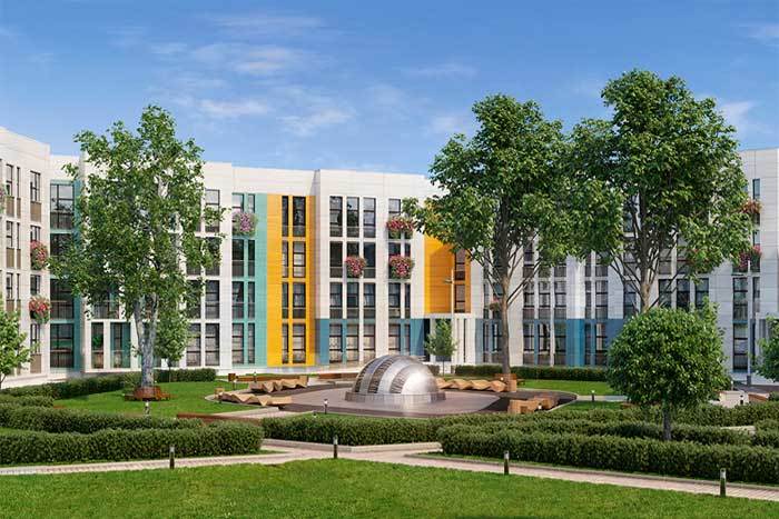 Комплекс малоэтажный - территория его застраивается 4-этажными зданиями, которые, благодаря оригинальной конфигурации, образуют уютные, просторные внутренние дворы, благоустраиваемые для отдыха жителей.