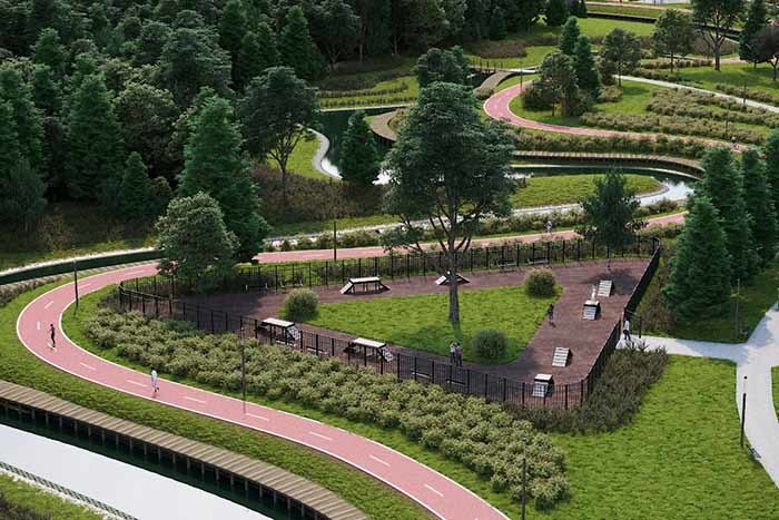 Для жителей же рядом домами оборудуются спортивные и детские площадки, места для отдыха, прокладываются прогулочные и велосипедные дорожки.