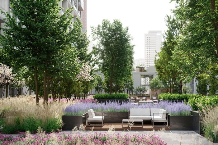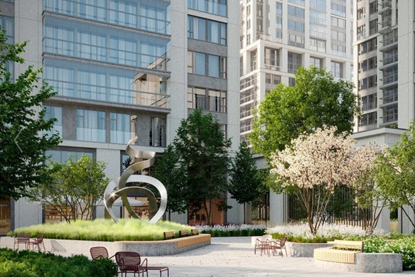 Огромный двор-парк с фонтаном, детскими и спортивными площадками, прогулочными террасами и садом станет отличным местом для отдыха и общественных мероприятий.