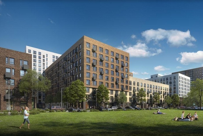 Три монолитных многосекционных корпуса переменной этажности возводятся по проекту известного столичного бюро, привлекая внимание теплыми тонами фасадов и большими окнами — виды отсюда открываются красивые.