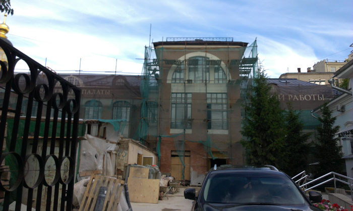 Сейчас во дворе «Кадашевских палат» кипит стройка. Но к концу года леса снимут, и будет виден фасад из розового «кабанчика» - характерная примета стиля модерн начала XX века.