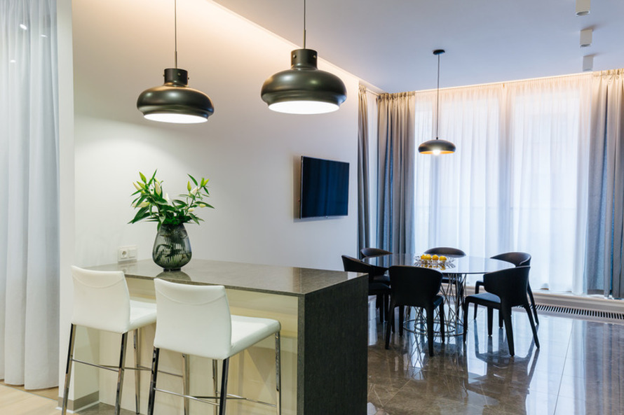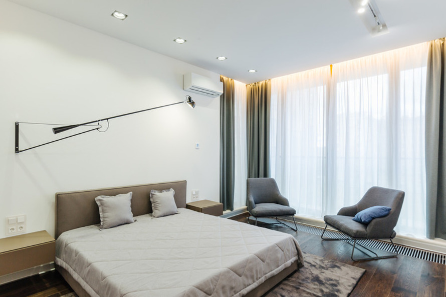 Такая же мастер-спальня имеется и в двушке площадью 112 кв. м. В этих апартаментах гостиная зона вынесена в холл и условно отделена от кухни. Хотя гостиная и остается без прямого источника света, освещение обеспечивается благодаря стеклянным дверям спальной зоны, граничащей с гостиной. То есть, по сути, двухкомнатная квартира превращается в полноценную трешку.