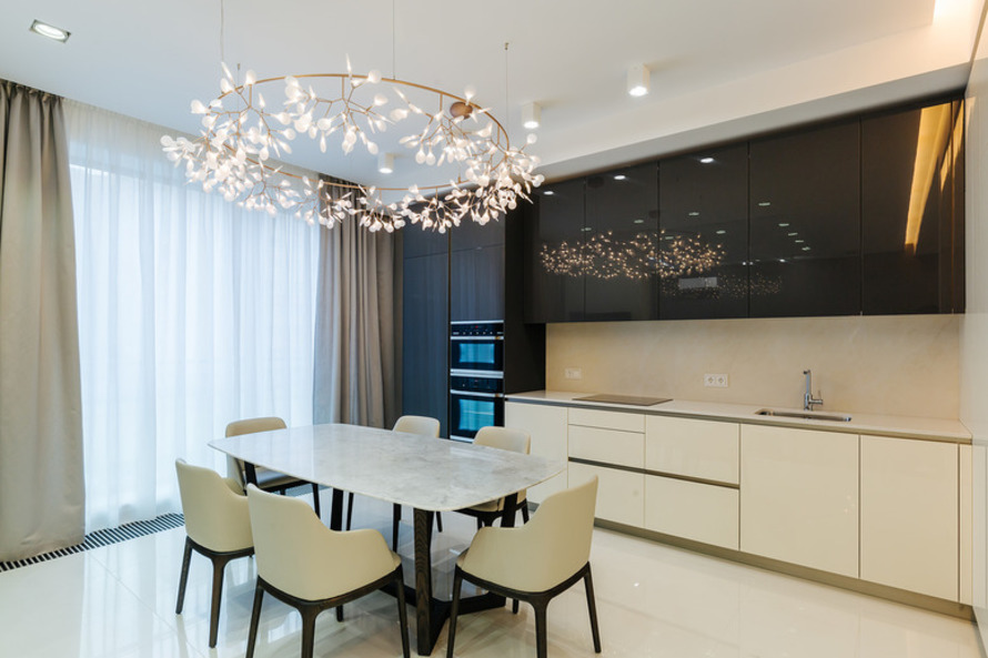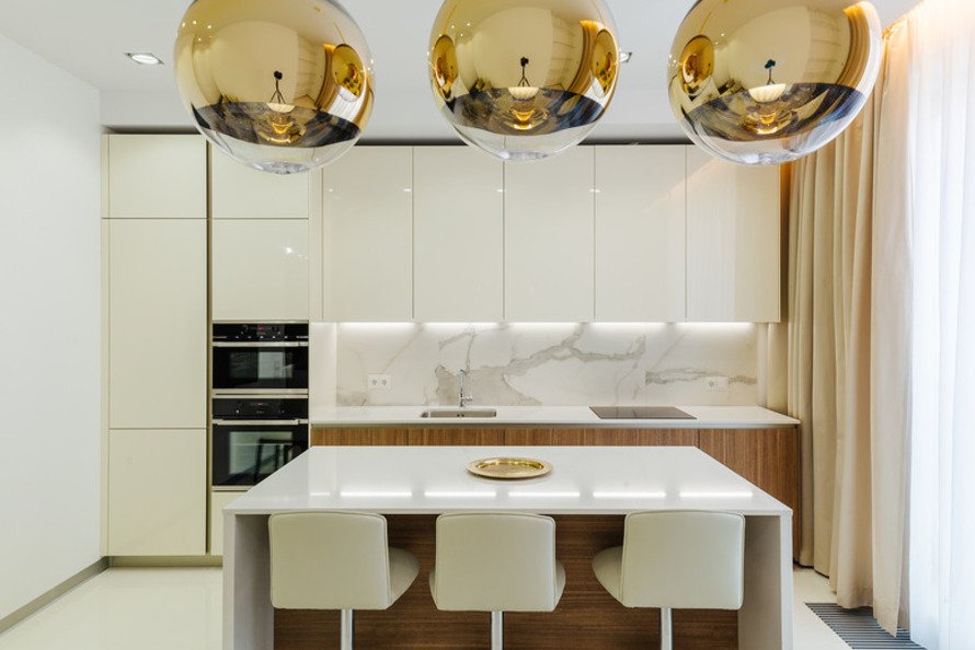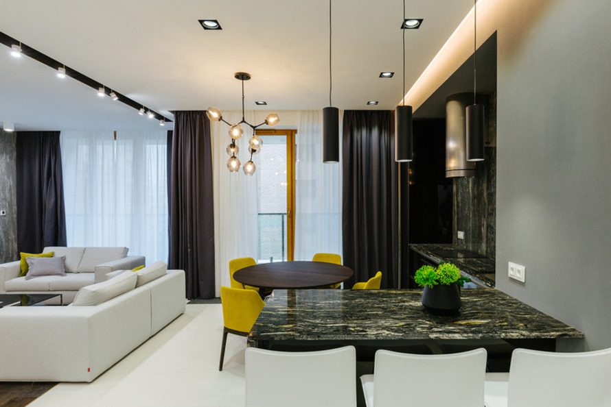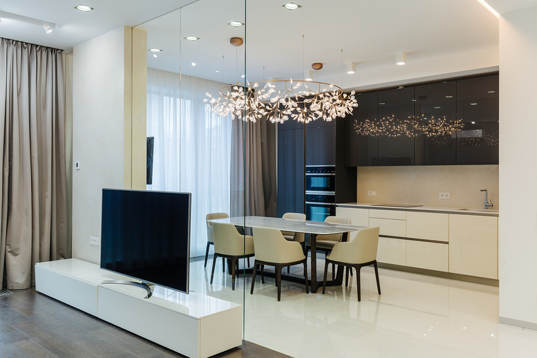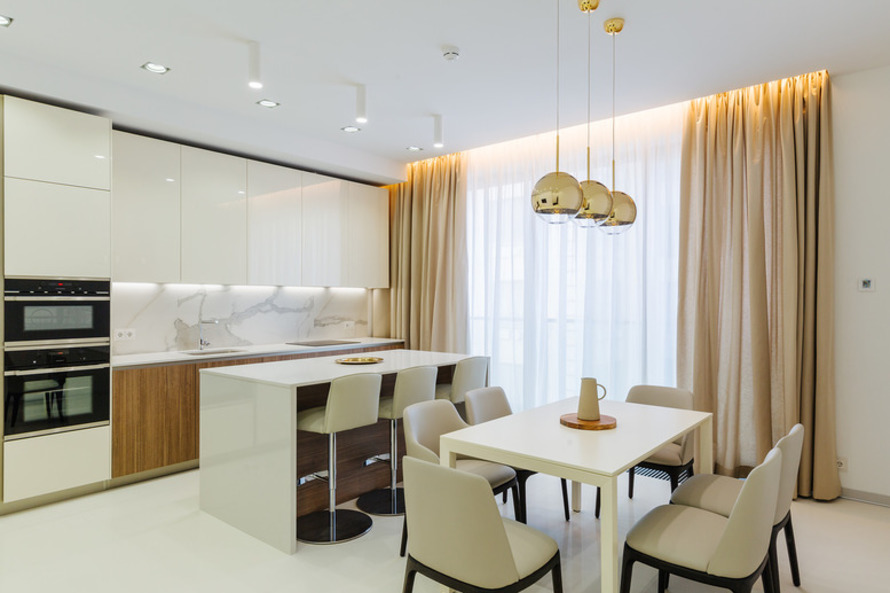 Везде используется принцип объединения кухни с гостиной, но решается он по-разному. Например, в 149-метровой трешке эти два пространства частично разделены тонкой прозрачной перегородкой. Еще одна особенность этих апартаментов — наличие мастер-спальни с просторной гардеробной и собственным санузлом.