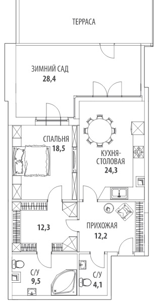 Или двухкомнатная линейная квартира площадью 112 кв. м, оборудованная просторными зимним садом и террасой, где тоже предполагается объединение гостиной и кухни. По сути, это большая евродвушка.
