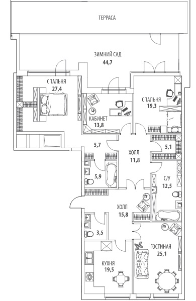 Есть и вариант распашной квартиры площадью 211 кв. м, оборудованной зимним садом и террасой.