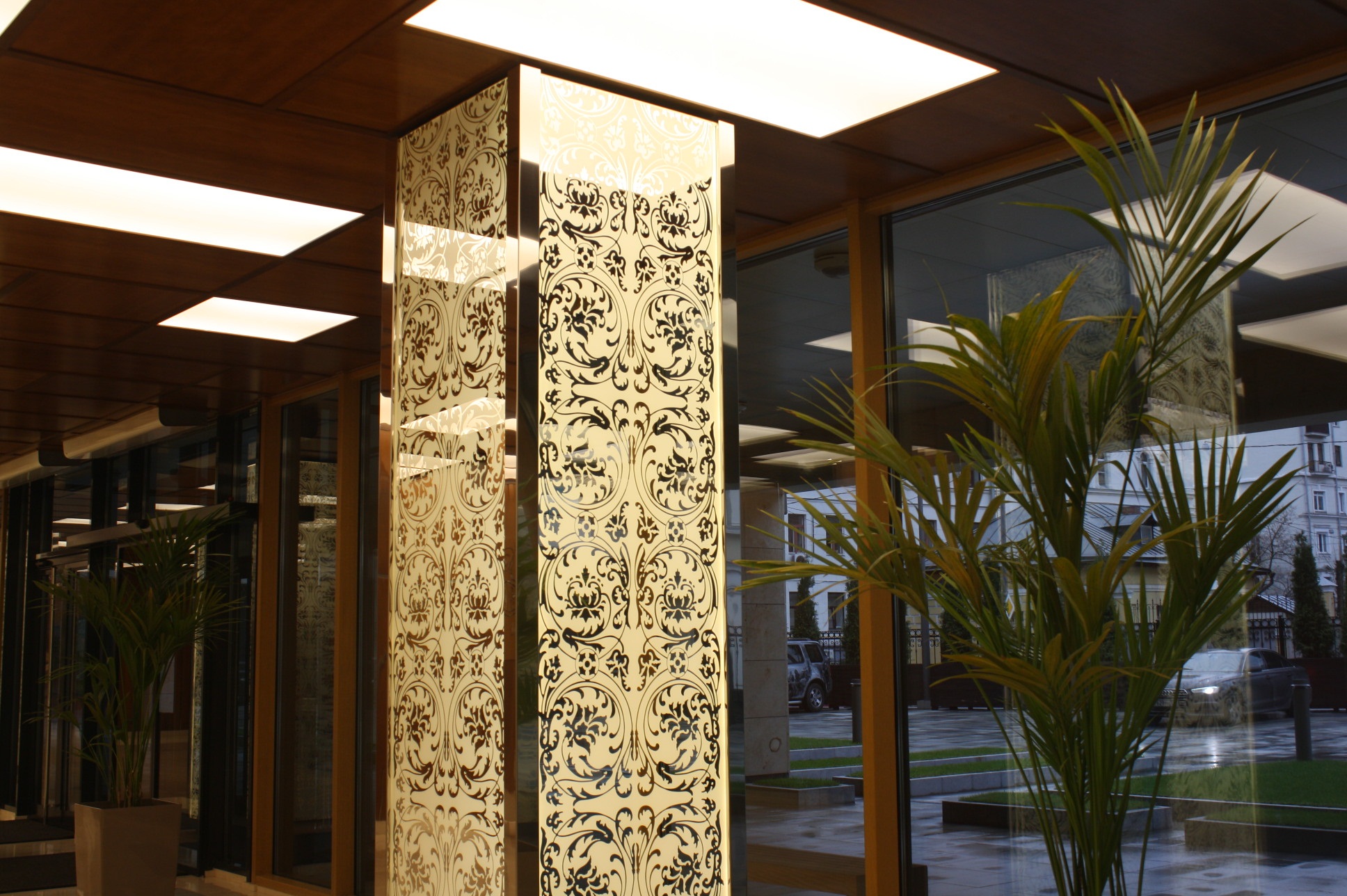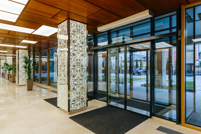 Входная группа и общественные пространства оформлены по эксклюзивному авторскому дизайн-проекту. На зеркалах, колоннах во входной группе, на потолке лифтов, на стеклянных ограждениях балконов, повторяется затейливый кружевной орнамент, который присутствует и на фасаде.