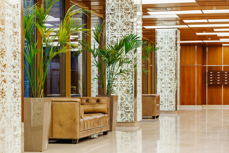 Первый этаж нежилой. Просторная входная группа оборудована панорамными стеклянными дверьми. В центральной части установлена стойка для консьержа, обустроена лаунж-зона с диванами и растениями.