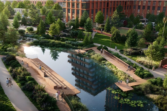 Центральным элементом квартала станет благоустроенный двор-парк с собственным прудом и зелеными зонами для прогулок и отдыха. В границах двора предусмотрены современные игровые и спортивные площадки: мультифункциональная зона воркаута, площадки для волейбола и стритбола, секция сквоша, столы для пинг-понга, площадки для пилатеса и йоги, скалодром, а также беговые и веломаршруты. В состав проекта войдет образовательный центр, включающий детский сад для 350 малышей и школу на 650 учеников.