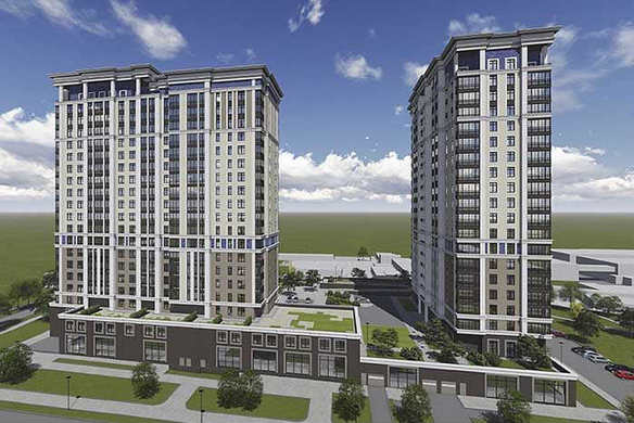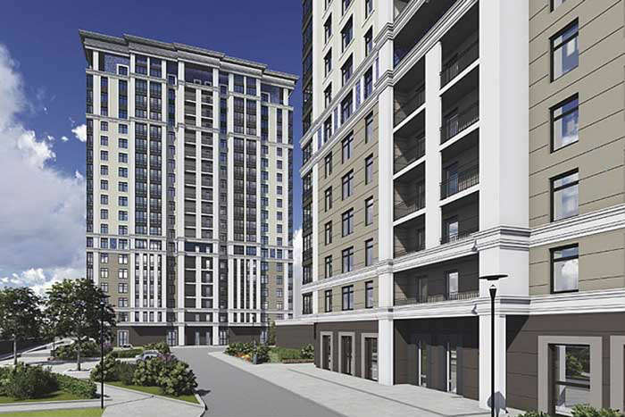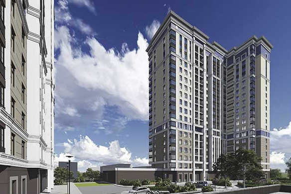 Новый комплекс — монолитный трехсекционный дом переменной этажности (18-19 этажей), привлекающий внимание необычной отделкой фасадов с использованием природного камня, декоративной штукатурки и элементов мозаики.