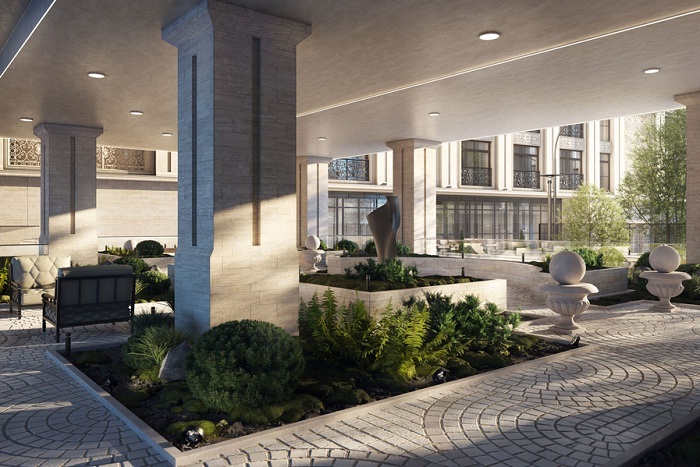 Во входных группах оборудуются лаунж-зоны с камином, переговорные комнаты, помещения для консьержей. Первый этаж отведен под объекты инфраструктуры — там откроются кафе, ресторан и торговая галерея, в подземном уровне разместится паркинг. «Изюминкой» станет «тайный сквер» - зеленое прогулочное пространство, размещенное внутри клубного дома.