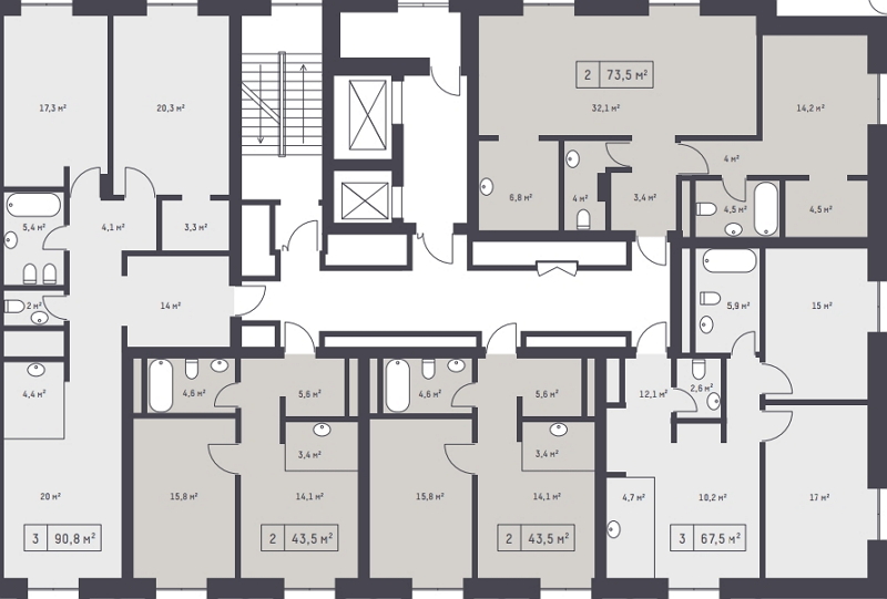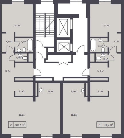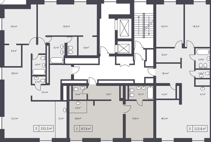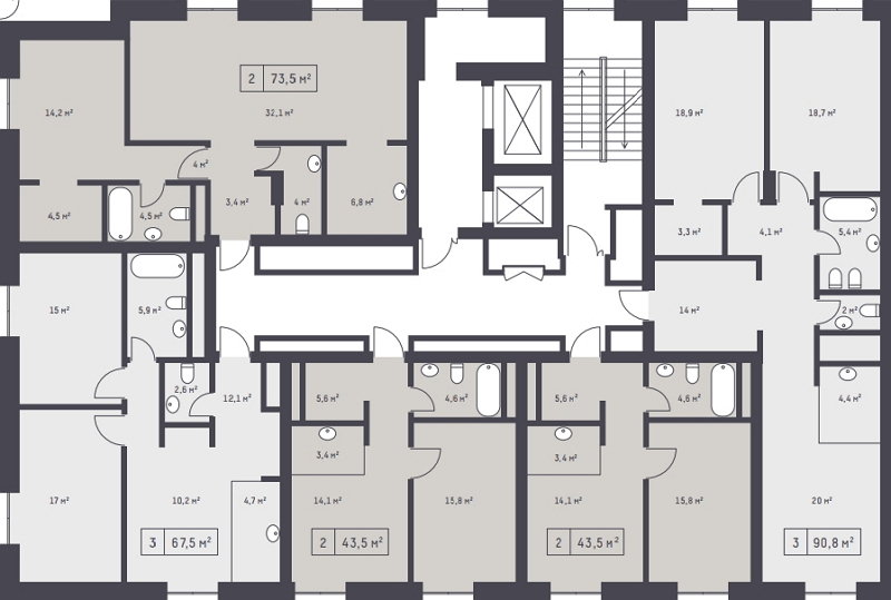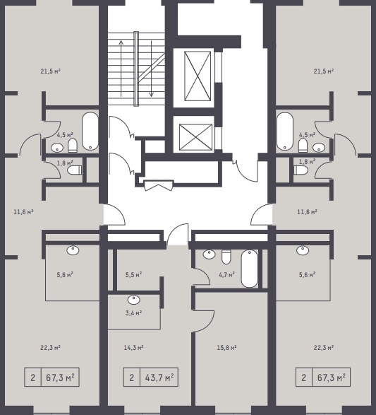 Верхние этажи здания отведены под восемь пентхаусов с увеличенными потолками и возможностью установки «второго света».