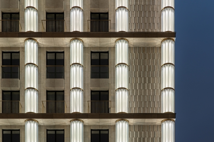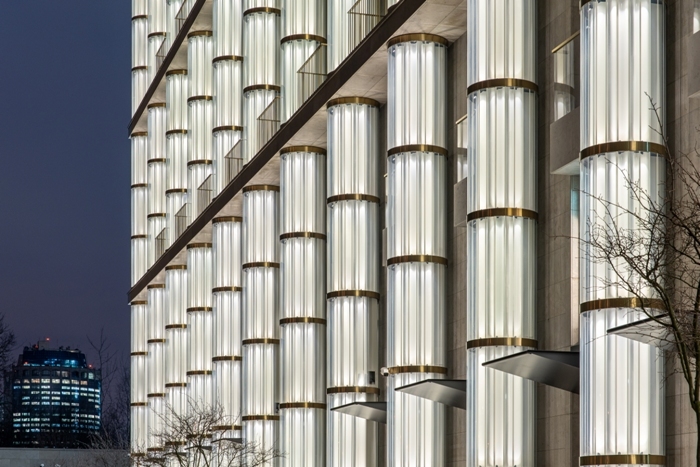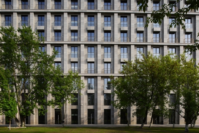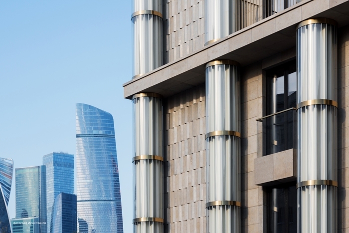 Авторство проекта принадлежит знаменитому архитектурному бюро. 11-этажный монолитный дом будет привлекать внимание пятиметровыми хрустальными колоннами на фасаде и огромными окнами, из которых открываются виды на весь деловой центр Москвы.
