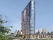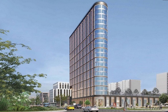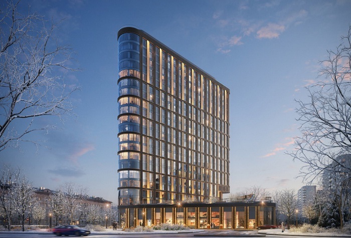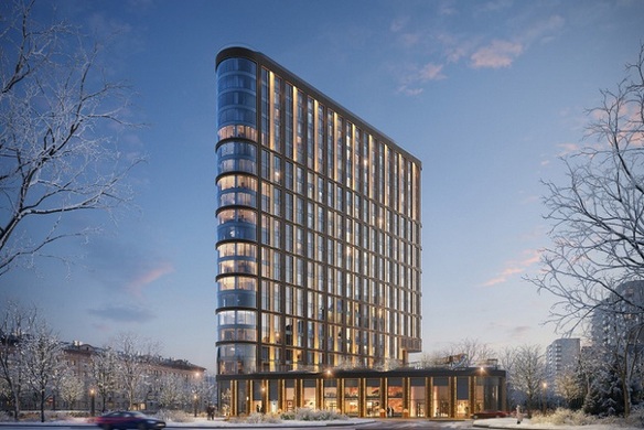 19-этажное монолитное здание располагается на стилобате, привлекая внимание необычным силуэтом и сплошным остеклением фасадов.