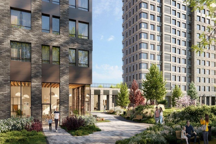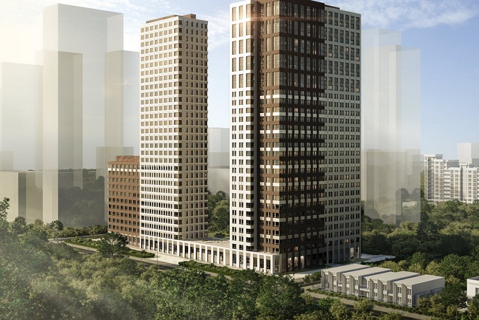 Новый комплекс — два корпуса переменной высотности (11-30 этажей), объединенных стилобатной частью — она отводится под инфраструктуру — торговые и офисные помещения, свой детский сад. В просторных входных группах разместятся лаунж-зоны и ресепшн.
